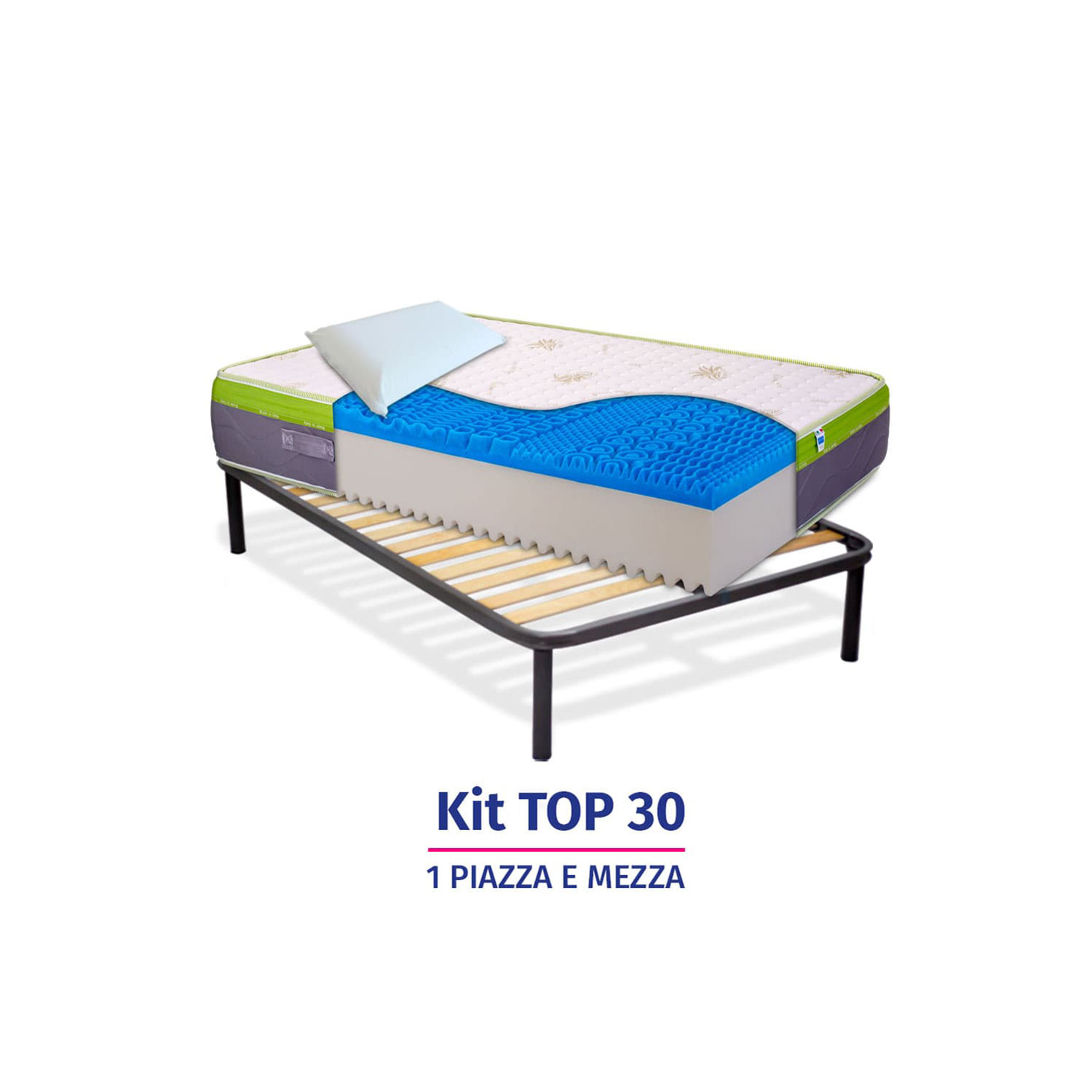 Il Kit Top 30 è composto dal materasso alto 30 cm e con memory gel breeze da 5 cm ad altamente traspirante e antiacaro. Nel kit è compresa anche la rete a doghe ortopedica in legno di faggio e ferro e i cuscini anatomici in memory foam.