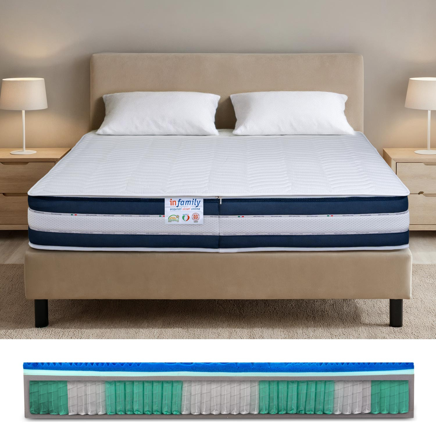 INFAMILY s.r.l. garantisce che tutti i materiali utilizzati sono certificati e controllati. Non utilizziamo materie prime tossiche: la qualità del tuo riposo è la nostra priorità.